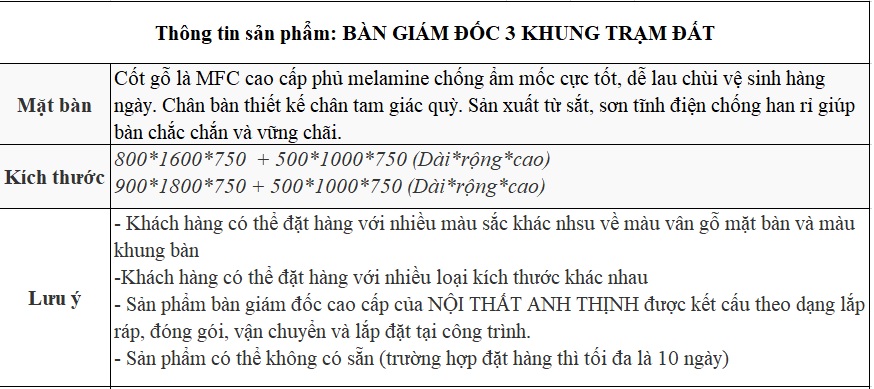 • Làm từ gỗ công nghiệp cao cấp, màu vân tinh tế, phủ melamine. Đặc biệt mặt bàn có khả năng chống trầy xước và mối mọt cao thích hợp với việc sử dụng ở Việt Nam với khí hậu nhiệt đới ẩm.
