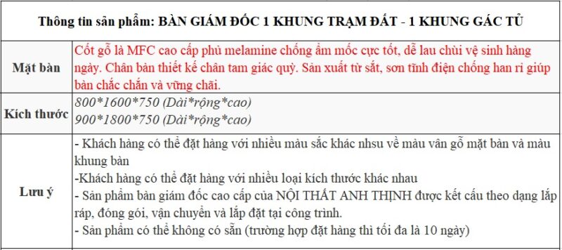 • Làm từ gỗ công nghiệp cao cấp, màu vân tinh tế, phủ melamine. Đặc biệt mặt bàn có khả năng chống trầy xước và mối mọt cao thích hợp với việc sử dụng ở Việt Nam với khí hậu nhiệt đới ẩm.