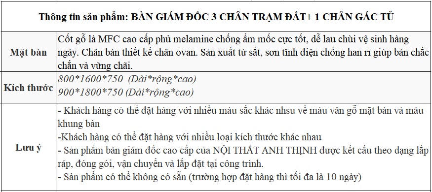 • Làm từ gỗ công nghiệp cao cấp, màu vân tinh tế, phủ melamine. Đặc biệt mặt bàn có khả năng chống trầy xước và mối mọt cao thích hợp với việc sử dụng ở Việt Nam với khí hậu nhiệt đới ẩm.